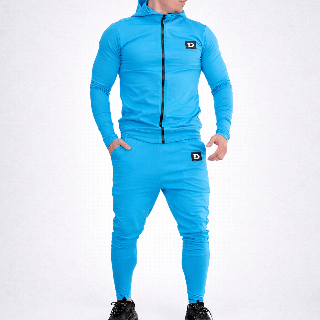 Treninguk este din bumbac, french terry, usor elastic, cu buzunare adanci la pantalon si buzunare cu fermoar la hanorac. Pantalonii au la glezna fermoar.