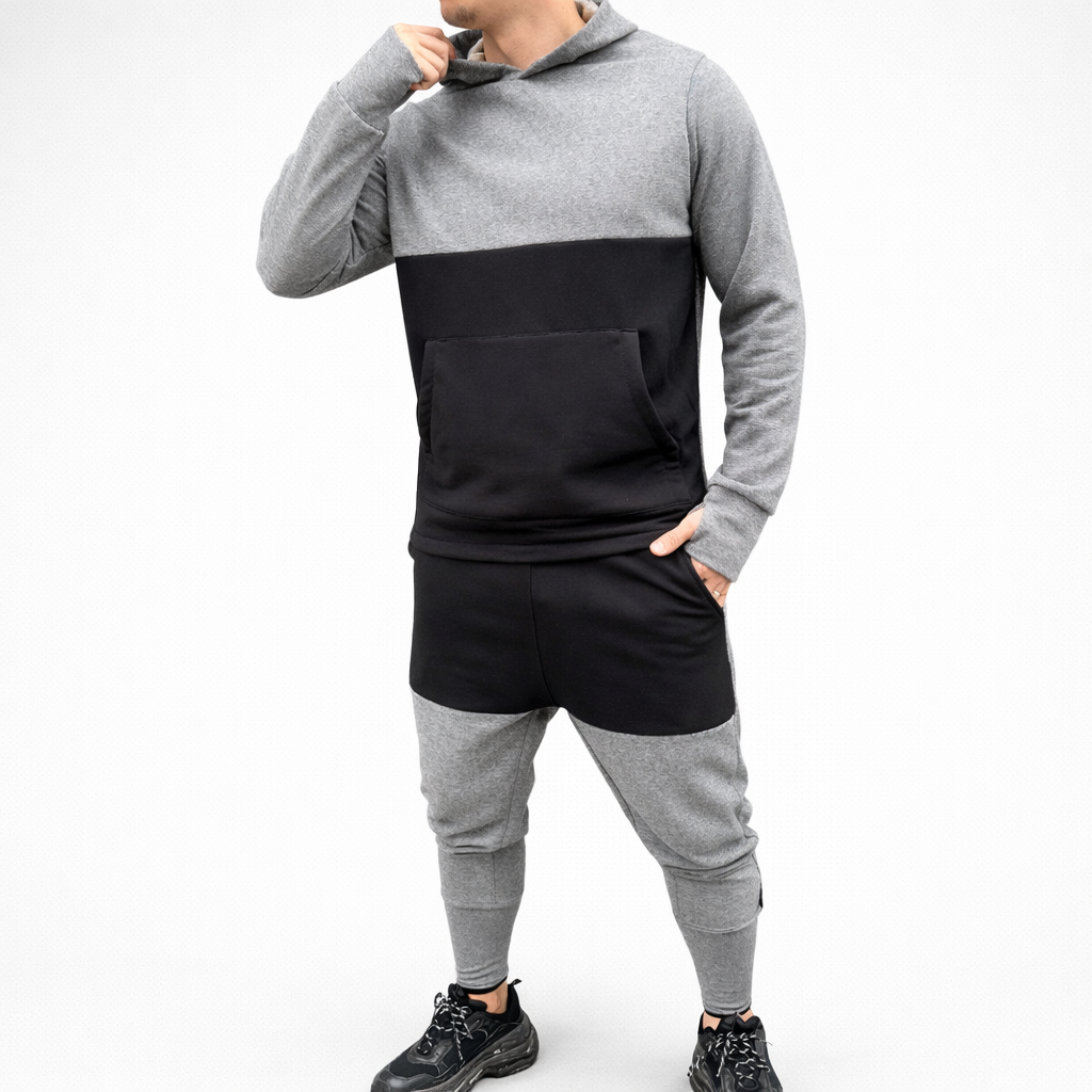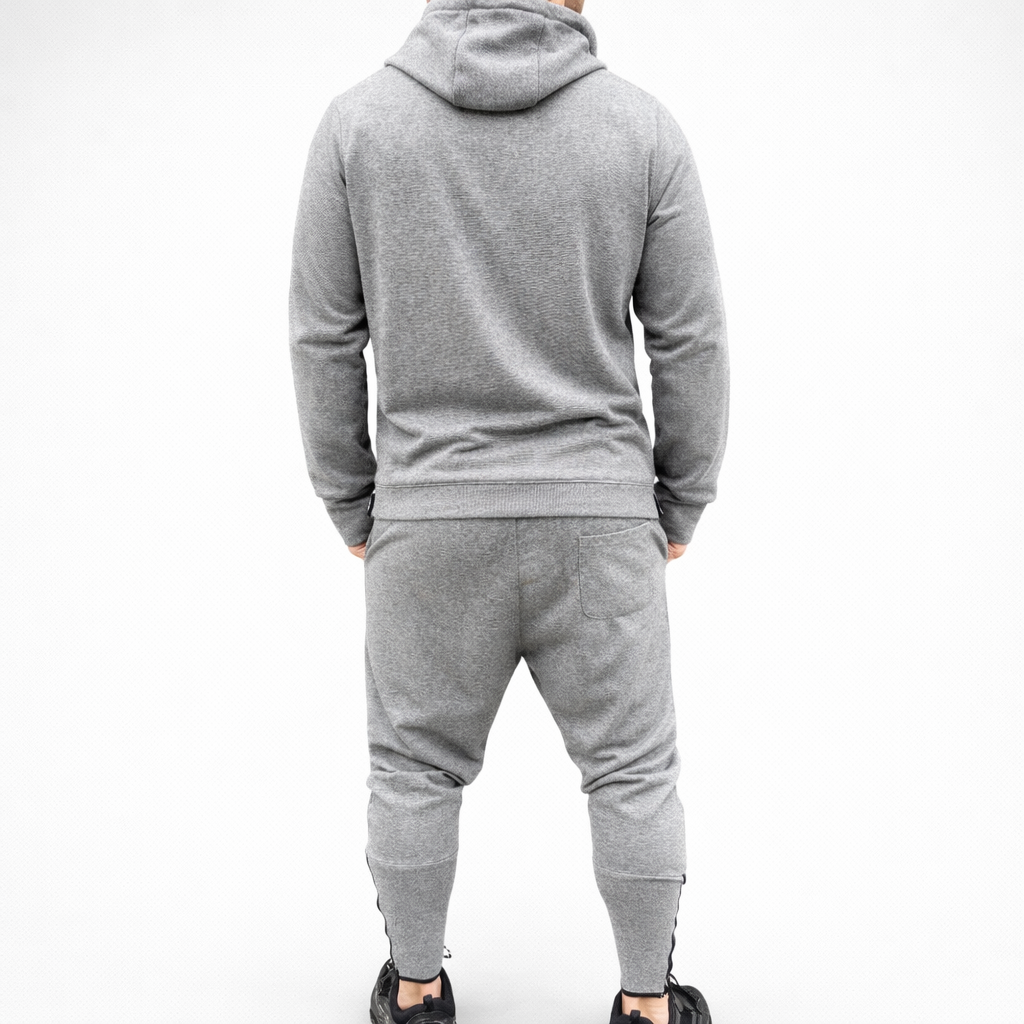 Treningul este format din pantaloni conici cu turul lasat, fermoar la glezna si hanorac cu gluga si buzunar aplicat.