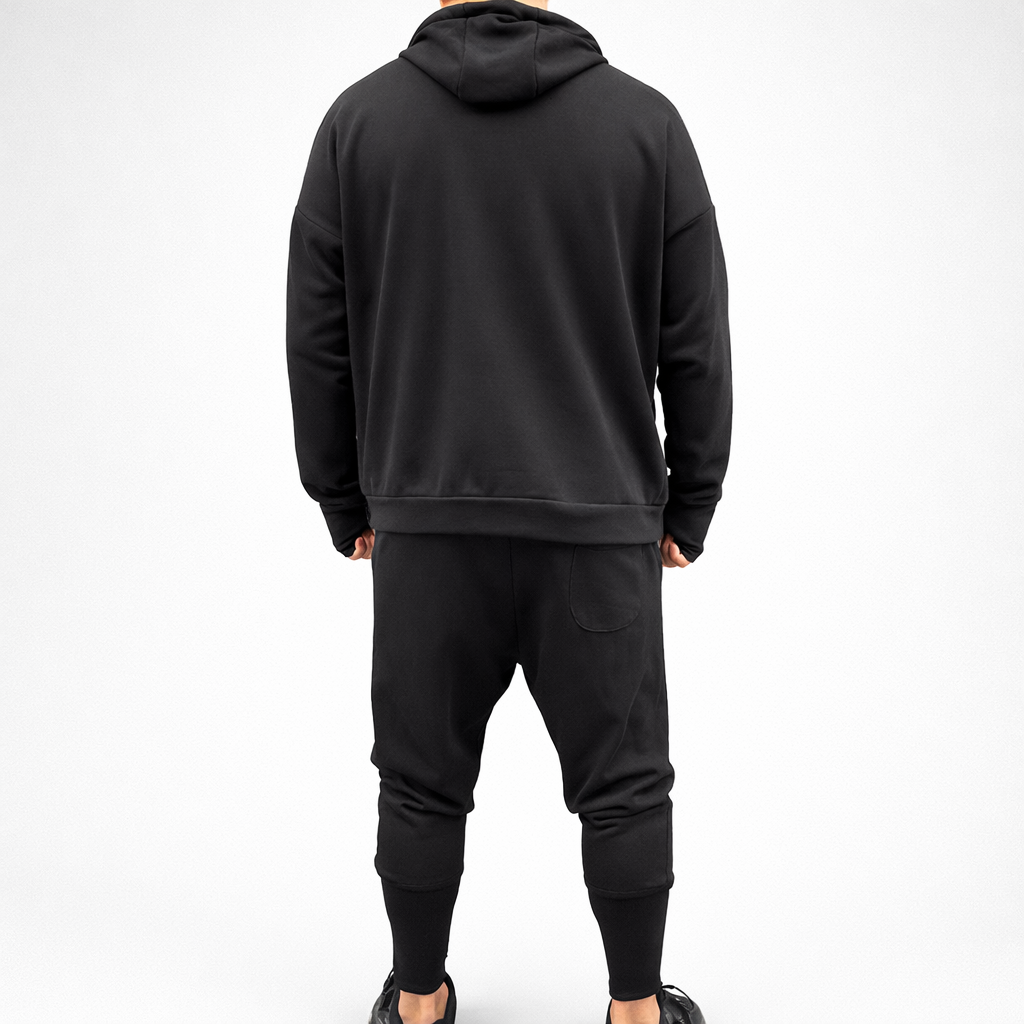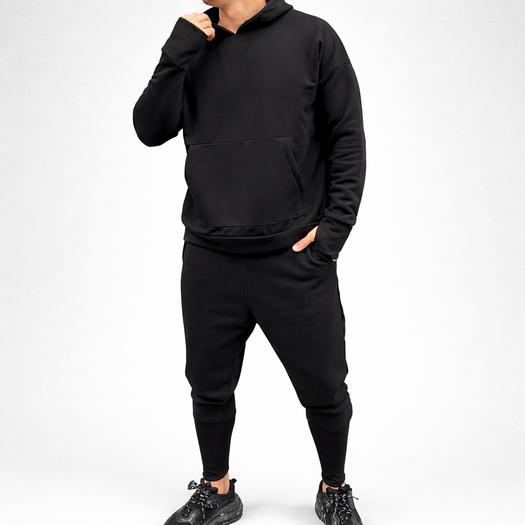 Treningul este format din pantaloni conici cu turul lasat, fermoar la glezna si hanoracul fara fermoar, cu gluga si buzunar aplicat. Model Oversize.