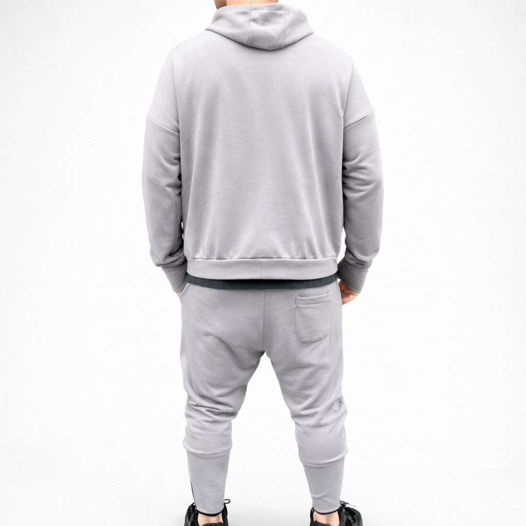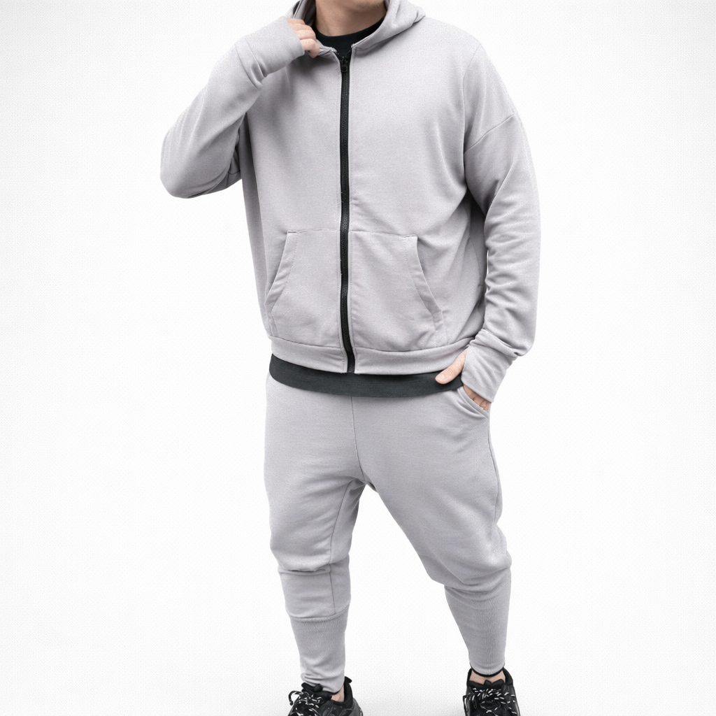 Treningul este format din pantaloni conici cu turul lasat, fermoar la glezna si hanoracul cu fermoar si buzunare aplicate. Model Oversize.