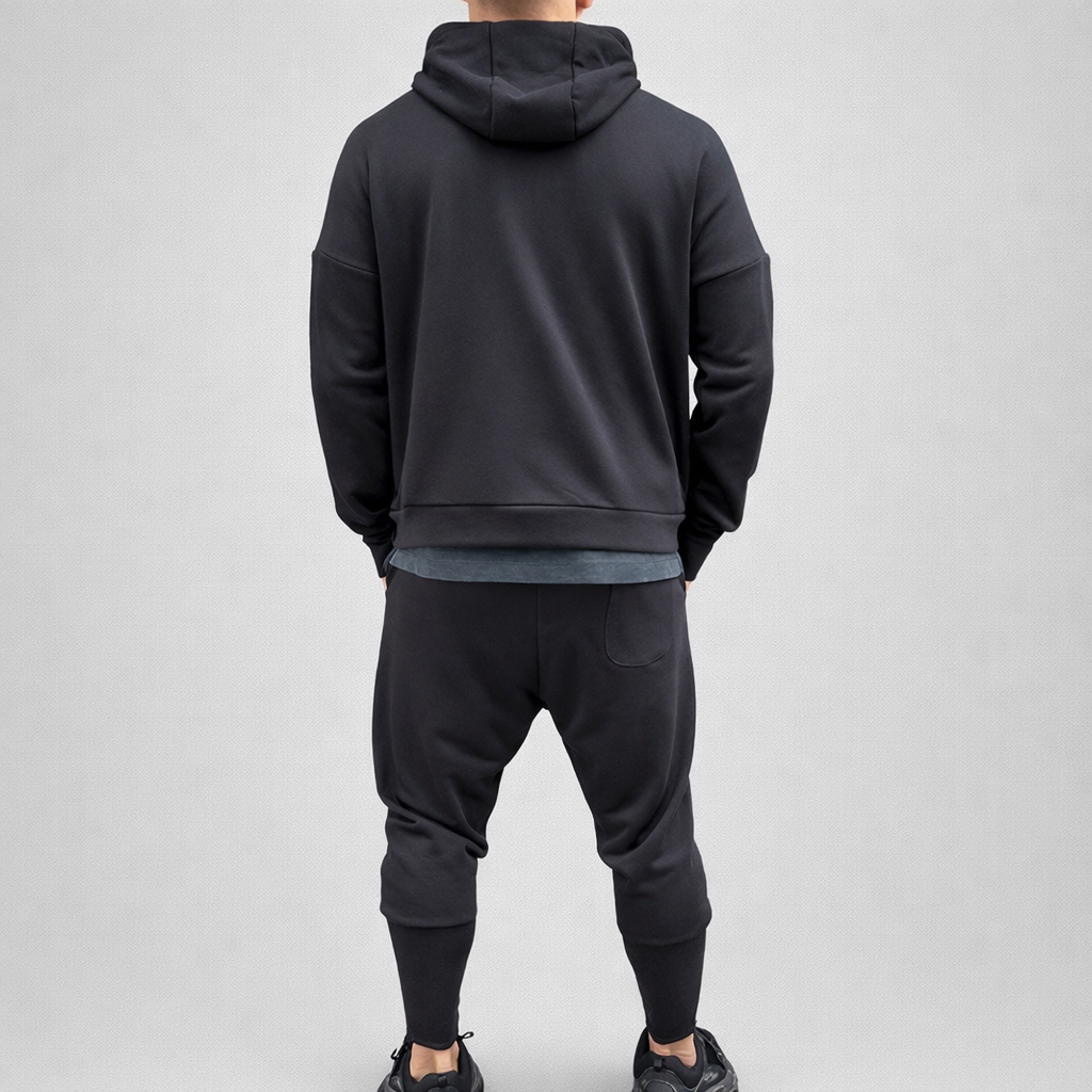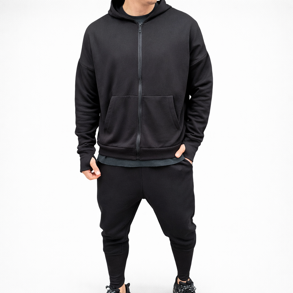 Treningul este format din pantaloni conici cu turul lasat, fermoar la glezna si hanoracul cu fermoar si buzunare aplicate. Model Oversize.